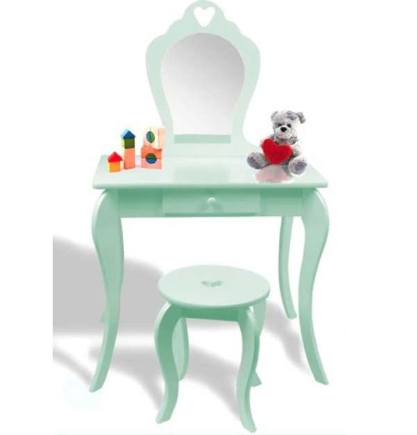 Biztonságos tükör (nem üveg) MDF bútorlapból készült Tágas fiók Finom díszítések A szék a csomag része Az asztalt a falhoz lehet rögzíteni MÉRETEK