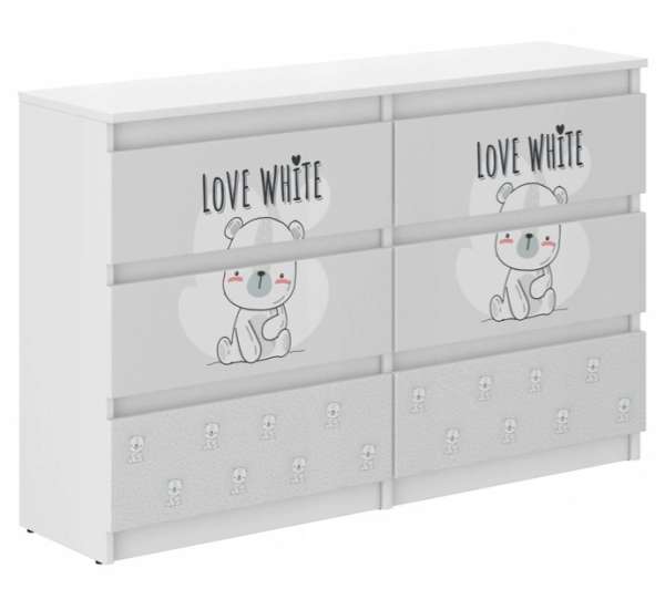 Elhozunk egy kollekciót, melyben gyönyörű komódokat találsz fiúknak és lányoknak. A meseszerű dizájnok, a minőségi anyagok és az élénk színek minden gyerekszobát egy kis mesevilággá varázsolnak. Kínálatunkban szereplő összes gyermek komódot úgy terveztük, hogy biztonságos és egyben esztétikus legyen. Gyönyörű és minőségi!A komód fehér forgácslapból készült, felületkezelt furnérral. A sínekre szerelt fiókok ütközőkkel vannak felszerelve, hogy megakadályozzák azok teljes kihúzását. A komód elülső része élénk, színes nyomattal rendelkezik, speciális laminált bevonattal, amely megakadályozza a fakulást és a kopást. Könnyű tisztítás nedves ruhával. Tulajdonságok:Anyaga: laminált lemez és PVCFiókok száma: 6 dbSzín: fehér + nyomatA komód méretei: 77 x 30 x 120 cm (magasság x mélység x szélesség)