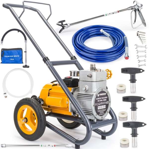 A hidrodinamikus festőegységek gyakorlatilag minden tipikus építési felület festésére szolgálnak, beleértve a lakó- és ipari épületek belső és külső falait is. A hidrodinamikus festés abból áll, hogy a festéket összenyomják és levegő használata nélkül szórják a festett felületekre. Alkalmasak emulziós, akril, latex festékek, vízszigetelő, többszínű festékek, valamint tűzálló, vízzel hígítható pácok, lakkok felhordására.Kevesebb festékfogyasztás a hengerrel vagy ecsettel történő festéshez képestNagy területek egyszínű festése, például lakások, garázsok, üzletek, acélszerkezetek és ipari csarnokok, négyszer kevesebb időt vesz igénybe, mint a hagyományos bevonatokFesthet függőlegesen és vízszintesen isA festőegység mobilis és kényelmesen használhatóFelszerelés:PM-PDM-1500M festőegységEredeti csomagolásSzívótömlő szűrővelTúlfolyó tömlőFestékszóró pisztoly szórófejjelPisztolytömlő (15m)Beállító kulcskészlet cipzáras zsebbenINGYENES - pisztolyhosszabbítás (50 cm)515 pisztolyfúvóka (0,015" nyílás - szórási szög 50°, kapacitás 0,87 l / perc)517-es pisztolyfúvóka (0,017 " nyílás - 50° szórási szög, teljesítmény kb. 1,13 l / perc) - (univerzális méret emulziós és latex festékekhez)621 pisztolyfúvóka (0,021" nyílás - 60°-os szórási szög, kb. 1,74 l/perc) - (akril-, emulzió- és latexfestékekhez való méret)Univerzális fúvókákA mellékelt pisztoly a piacon elérhető, különböző gyártóktól származó fúvókák széles választékával működik.A készletünk többek között tartalmazza az 517-es fúvókát, amely ideális emulziós és latex festékekkel való festéshez.Könnyű tisztítás és karbantartásHa a munkavégzés során több perces szünetet tart, zárja le a pisztoly ravaszát, és merítse a fúvókát egy megfelelő oldószerrel vagy vízzel, ha vízbázisú festékről van szó. Ez megakadályozza a festék megkeményedését. Ne felejtse el engedni a nyomást az egységben.Ha a fúvóka eltömődik, tisztítsa meg úgy, hogy a SPRAY pozícióból (nyíl a pisztoly kimenete felé) 180 fokkal a TISZTÍTÁS pozícióba fordítja (a pisztoly irányával ellentétes nyíl). Ha ez nem segít, ellenőrizze a pisztoly fogantyújában lévő szűrőt.Az eszköz mobilitásaA nagyon hatékony és nehéz motornak köszönhetően az egység kiváló minőségű, kemény poliuretán habból készült, gumiréteggel borított közúti kerekekkel van felszerelve, míg az elülső része erős gumi (csúszásmentes) támasztékokkal rendelkezik.Specifikációk:A készülék teljesítménye: 1500 WÜzemi nyomás: 225 bar-igMax. közepes adagolási sebesség_ akár 2,54 l/percMaximális fúvókaméret: 0,025" - (0,63 mm)Motor típusa: kefe nélküliKompressziós mechanizmus: dugattyús szivattyúA pisztolyhoz vezető tömlő hossza: 15 mNettó tömeg_ 33,6 kgBruttó tömeg_ 38 kg