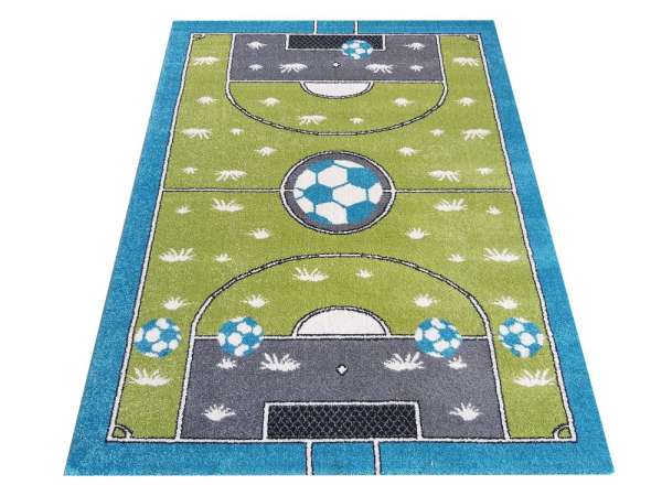 Színes szőnyeg, focipálya motívummal, kiváló minőségű anyagból és a legújabb divattrendek szerint tervezve. Specifikációk: Súly: 2550g/m2 Alakja: téglalap alakú Anyaga: 100% PP Heat Set Frise Színe: kék és zöld Mosógépben mosható: nem Szálmagasság_ 13 mm Csúszásmentes aljzat: nem