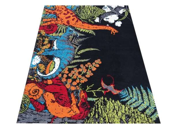 Színes szőnyeg, dinoszaurusz motívummal, kiváló minőségű anyagból és a legújabb divattrendek szerint tervezve. Specifikációk: Súlya: 2550g/m2 Alakja: téglalap alakú Anyaga: 100% PP Heat Set Frise Színe: fekete Mosógépben mosható: nem Szálmagasság_ 13 mm Csúszásmentes aljzat: nem
