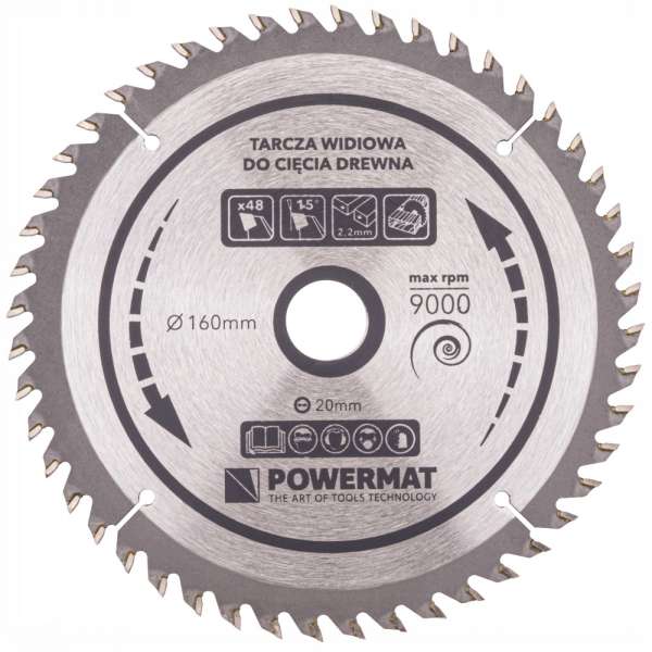 Kézi fűrészekhez, gérvágó fűrészekhez és asztali fűrészekhez tervezték. A Powermat körfűrésztárcsát úgy alakították ki, hogy nagyon gyorsan forogjon, így biztosítva a könnyű és gyors vágást vele. Szabványos asztali kör- és gérvágófűrészekhez. A penge külső mérete 160 mm. A rögzítőfurat 20 mm-es.Specifikációk: Külső átmérő: 160 mmSzerelőnyílás átmérő: 20 mmVágófogak száma: 48Fogak szöge: +15°Csökkentőgyűrűk: 16 mmVágási vastagság_ 2,2 mmMaximális fordulatszám: 9000 rpmAlkalmazás: fához és puha anyagokhozAnyaga: edzett acél