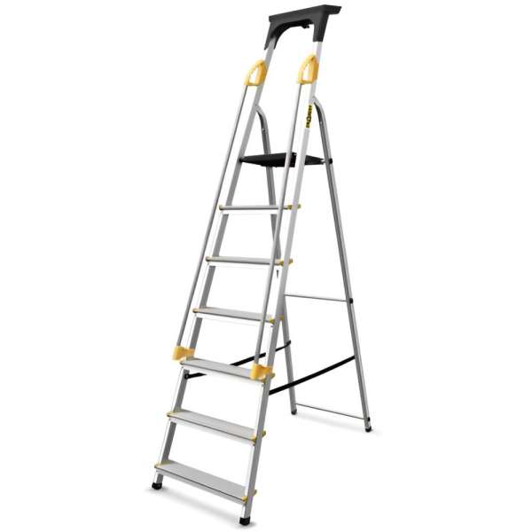 Robusztus, kompakt kialakítás a legmagasabb biztonsági paraméterekkel. A létra kényelmes, ergonomikus fogantyúkkal rendelkezik, amelyek növelik a stabilitást és a mindennapi munkavégzés során a használat kényelmét. Nagy teherbírás akár 150 kg-ig. Nagyszerű lesz a háztartásokban végzett munkához, de széleskörű alkalmazásra talál a kis- és középvállalkozásoknál vagy a takarító és felújító cégeknél is. Stabil megerősítések és széles lépcsőfokok csúszásmentes bevágásokkal. A létra stabil, csúszásmentes műanyag lábakon áll. Könnyű és egymásra rakható szerkezet alumíniumból. A termék megfelel az EN 131 szabványnak.Műszaki paraméterek:Anyag_ alumíniumA válaszfalcsatlakozás típusa:szegecselésLépcsőfokok száma:7Magasság az emelvényig_0.43 mMaximális terhelhetőség_150 kgA Munkamagasság_3,4 mB Magasság az emelvényig_1.4 mC Létra szélessége:0,5 mD Összecsukott létra hossza:2,15 mG Összecsukott létra vastagsága:0,115 mVastagság korlátokkal:0.2 mSúly:6,9 kgBejárat:egyoldalasFelszereltség_polc és korlát