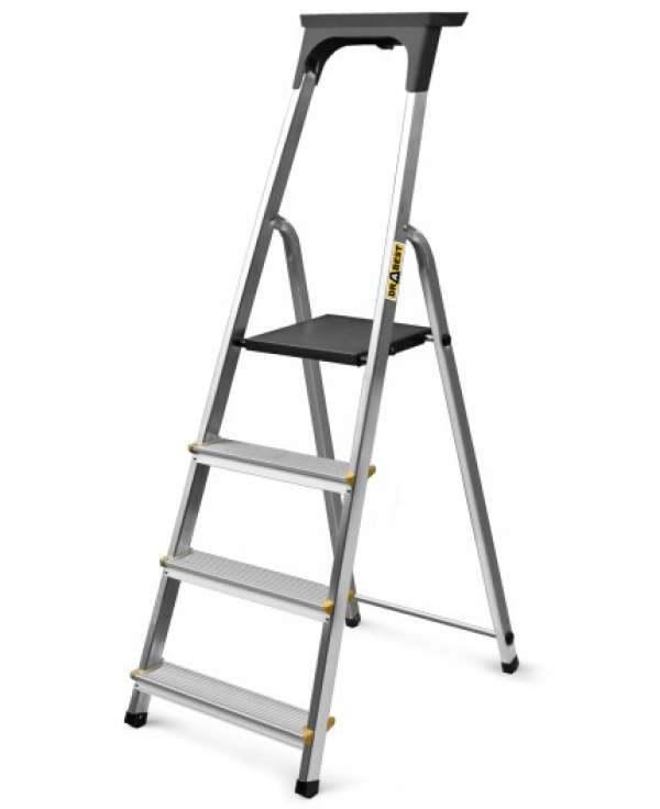 A létra törés- és sérülésálló alumíniumból készült. Könnyű, könnyen összecsukható és tárolható. Tökéletes otthonokba, társasházakba, lakásokba, mindennapi használatra és felújításhoz. Műanyag lábakkal és a lépcsőfokok további védelmével rendelkezik a csúszásmentes bevágásoknak köszönhetően. Teherbírása 150 kilogramm. Nagyméretű, 25 cm x 26 cm-es munkafelülettel rendelkezik. Megfelel az EN 131 szabványban meghatározott legmagasabb tartóssági követelményeknek.Műszaki paraméterek:Anyag_ alumíniumA válaszfalak csatlakoztatásának típusa:szegecselésLépcsőfokok száma:4Maximális terhelhetőség_150 kgA Munkamagasság_2,75 mB Magasság az emelvényig_0.75 mC Létra szélessége:0,43 mD Összecsukott létra hossza:1,45 mG Összecsukott létra vastagsága:0,155 mSúly:3,7 kgBemenet:egyoldalasFelszereltség_polc