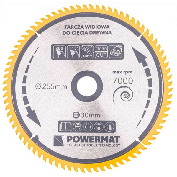Kézi fűrészekhez, kis gérnafűrészekhez és asztali fűrészekhez tervezték. A Powermat pengét nagyon gyors forgáshoz igazították, ami kellemes és kényelmes munkavégzést biztosít. Szabványos asztali kör- és gérvágófűrészekhez. A penge külső mérete 255 mm. A rögzítőfurat 30 mm-es. Műszaki paraméterek: Külső átmérő: 255 mm Furat átmérője: 30 mm Fogak száma: 80 A fogak szöge: +15° Vágási vastagság_ 2,8 mm Maximális fordulatszám: 7000 rpm Alkalmazás: fához és puha anyagokhoz Anyag_ edzett acél