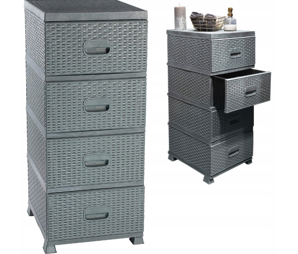 A komód egy olyan bútordarab, amely sosem megy ki a divatból és minden helyiségben felhasználásra lel - folyosón, előszobában, konyhában, nappaliban, hálóban, vagy fürdőben. Praktikus, minden tárgy elfér benne, igy sok helyet megtudunk spórolni. Rendkivül tágas és stabil lábakon áll. A komód tetszés szerint összeállítható. Kombinálhat 2 komódot, létrehozhat egy 8 fiókos oszlopot Az összeszerelés előtt érdemes az összeillesztett részeket krémmel vagy szappannal bekenni. Ez megkönnyíti az összeszerelését.Tulajdonságok:Méretek: 37 x 44 x 90 cmEgyszerű összeszerelésA fiók belsejének színe változhatAnyaga: polietilén