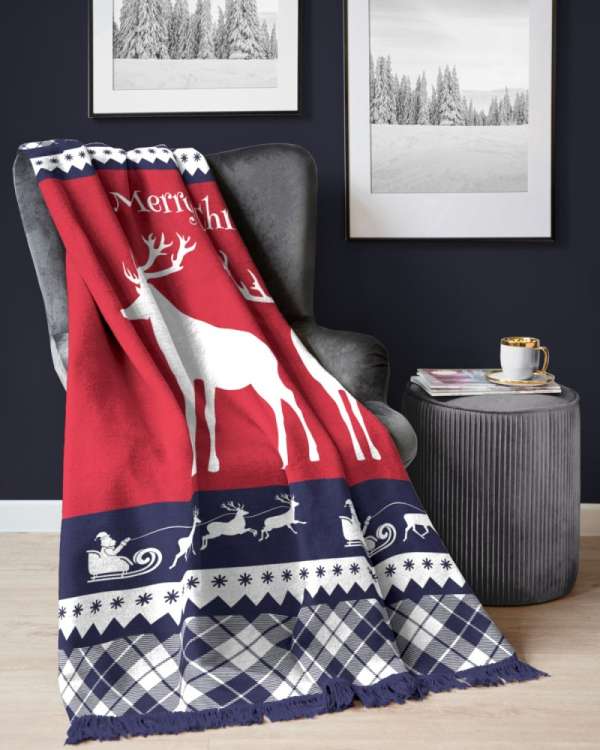 A modern karácsonyi motívummal, rojtokkal díszített takaró tökéletesen kiegészíti a karácsonyi hangulatot. A takaró nagyon puha és rendkívül kellemes tapintású pamut-akril anyagból készült. A pamut és az akril kombinációnak köszönhetően a takaró anyaga rendkívül tartós, sok mosás után sem változtatja meg az alakját és nem gyűrődik. Az akril emellett könnyű és gyorsan szárad. Specifikációk:Színe: piros, kékAnyaga: 58% pamut, 32% akril, 10% poliészterMérettűrés: +/- 5%