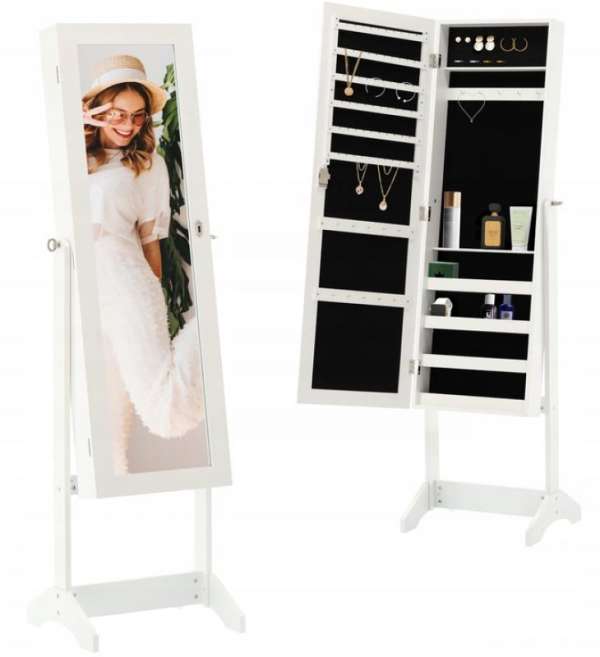 A tükörrel ellátott ékszertartó szekrény minden bizonnyal nagyszerű ajándéktipp minden nő számára. A tükör mögött rengeteg ékszer, bizsu és más apróságok tárolására van lehetőség. A szekrény ajtaja egy kis kulccsal zárható, így illetéktelenek nem nyithatják ki. Letisztult formavilágának köszönhetően a legtöbb helyiségbe illik, tökéletes kiegészítője lehet egy hálószobának, fürdőszobának vagy nappalinak.Specifikációk:Színe: fehérAnyaga: MDF lapMéretek: 41,5 x 36,5 x 147 cmTulajdonságok:Nagy tükörPuha plüssel párnázottKampókkal, akasztókkal, polcokkal van felszerelveKulccsal zárható
