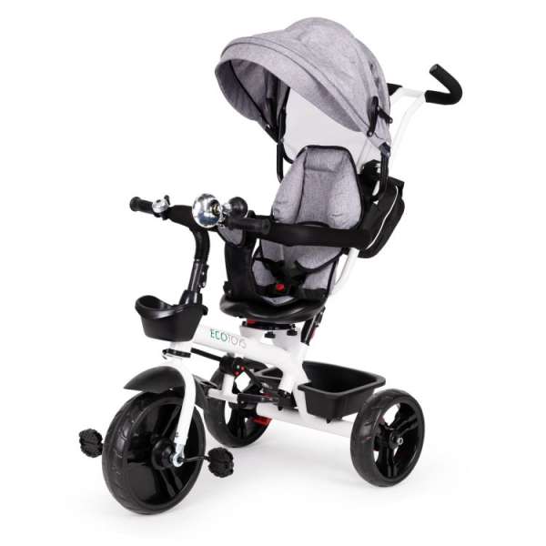 A tricikli gyerekkerékpárként és babakocsiként is használható. A kerékpár váza biztonságos, fehérre festett acélból készült. A tricikli vezetőruddal rendelkezik, amely lehetővé teszi a szülők számára a kormányzást. Az ülés elforgatható a haladás irányába vagy a szülő felé fordítva és megkönnyíti a legkisebb gyermekek felszállását is. A gyermek biztonságáról az 5 pontos övek és a kiesést megakadályozó fogantyúk gondoskodnak. A kisebb gyermekek számára előnyösek a lehajtható lábtartók. A kerekek tartós, defektálló EVA anyagból készültek. A tricikli összecsukható előtetővel és kosarakkal van ellátva. A tricikli 12 hónap és 4 éves kor közötti gyerekek számára alkalmas.Specifikációk:Színe: szürkeA méretek a termékképeken találhatók.Terhelhetőség_ 25 kg