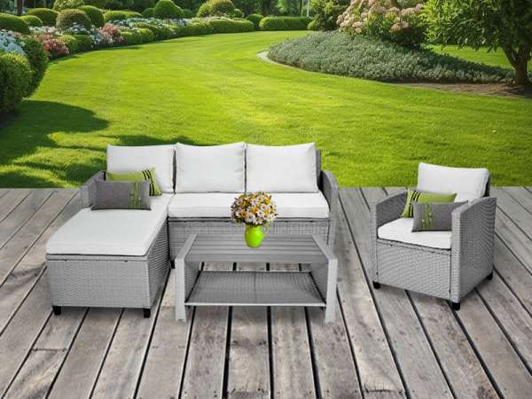 Ez a szett egy sarok ülőgarnitúrát és egy asztalt foglal magába, ami elegendő helyet biztosít akár 5 ember számára. Igényes kivitelezésével és kellemes hangulatával biztosan tetszeni fog mindenkinek. Szerkezetének köszönhetően könnyen mozgatható, de mégis nagyon stabil és kényelmes ülőhelyeket biztosít. Ellenáll az időjárási viszontagságoknak. A szettet stílusos párnák egészítik ki, amelyeket az ülésre és a háttámlára helyeznek. Specifikációk:Színe: szürkeSarokkanapé méretei: 136 x 178 x 63 x 77 cmKanapé méretei: 118 x 63 x 77 cmFotel méretei: 66 x 62 x 77 cmAsztal méretei: 92 x 56 x 42 cmMaximális terherbírás: 400 kgCsomag tartalma: 1 db sarokkanapé, 1 db fotel, 1 db dohányzóasztal, 4 db hátpárna, 3 db ülőpárna