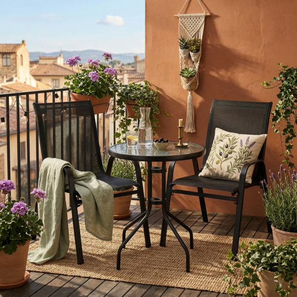 A GARDENLINE kertibútor szett tökéletes azoknak, akik a klasszikus és az elegancia kombinációját keresik. Bárhol elfér - az erkélyen, a teraszon vagy a kertben. Az asztal edzett üvegből készült, átlátszó mozaik textúrával (önszereléshez), és biztos, hogy hosszú évekig használható. A borítás a vázra feszített vastag fonott anyagból készült. Remekül fog mutatni az otthoni kert magánéletében és a kereskedelmi helyiségekben egyaránt. Műszaki adatok: Szín: fekete A csomag egy asztalt és két széket tartalmaz