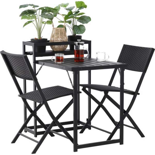Rendezze be az erkélyét és a teraszát stílusos bútorokkal! Bútorszettünk tökéletesen megfelel minden elvárásának. A modern dizájn, a minőségi tartós anyagok és a funkcionalitás azok a tulajdonságok, amelyek megkülönböztetik termékünket a többitől. Hozzon létre egy oázist a pihenés és a stílus számára, és töltse kellemes környezetben a meleg napokat. Rendeljen még ma és élvezze minden pillanatát a pihenésnek.Specifikációk: Színe: feketeAnyaga: műanyag és acélMéretek: a termékképeken láthatókCsomag tartalma: asztal és 2 db szék
