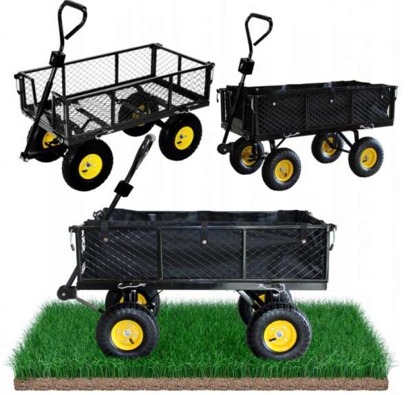 A kocsi nagyon hasznos lesz a háztartási munkák során, alkalmas föld, homok, különféle tárgyak, szerszámok stb. szállítására. A kocsi műhelyekben, raktárakban vagy más munkákban is használható. Nagyon erős fémszerkezettel rendelkezik, maximum 300 kg súlyt képes elviselni. Levehető fedővel rendelkezik, amely nagyon hasznos lesz apró tárgyak, homok stb. szállításakor. A felfújható kerekek futófelülettel vannak ellátva, amely kiváló tapadást biztosít a talajon.A kocsi fogantyúja csúszásmentes felülettel rendelkezik, és kétféle módon teszi lehetővé a kocsi használatát. Húzhatja / tolhatja a kocsit, vagy rögzítheti egy kicsi, kerti traktorhoz. A torziós tengely lehetővé teszi a 180 fokos elfordulást, megkönnyítve a kocsi használatát. A kocsi szétszerelve kerül szállításra, és a csomag tartalmazza az összeszereléshez szükséges kiegészítőket.Specifikációk:Méretek: 102 x 52 x 25 cmRúd hossza: 80 cmKerék átmérője: 26 cmTeherbírás: 300 kg