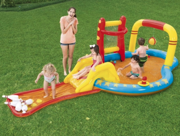 Szeretne felejthetetlen szórakozást nyújtani gyermekének a kertje kényelmében? A felfújható játszótérnek köszönhetően gyermeke remekül szórakozik majd a friss levegőn, és felejthetetlen élményeket szerez. A felfújható attrakciókkal, például felfújható csúszdával, szökőkúttal, bowlinggal ellátott medence biztosan örömet szerez gyermekének és kedvenc játszóhelyévé válik. A medence puha, de tartós anyagból készül, és rendkívül biztonságos a legkisebbek számára is.Specifikációk:Felfújható medencefenék: igenMedence űrtartalma: 314 lLeeresztő szelep: igenMéretek: 435 x 117 x 213 cmSúlya: 6, 5 kg