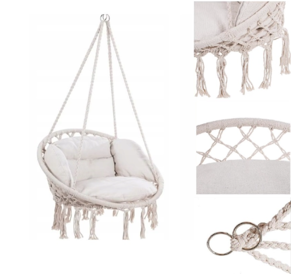 Az egyedi kialakítású függő hintaszék nemcsak kényelmes, hanem bármilyen belső teret vagy kültéri helyszínt vonzóbbá varázsol. A dekoratív fonat és a bojtok a modern design elegáns kiegészítői, miközben a szék stabil fogantyúval rendelkezik, amely lehetővé teszi a biztonságos rögzítést fára, hintaszerkezetre vagy mennyezeti kampóra.Ez a hintaszék tökéletes helyet biztosít a pihenéshez – akár egy jó könyvvel, akár kedvenc zenéjével. Gyerekek számára is ideális hintaként, hiszen szórakoztató és biztonságos módot nyújt a kikapcsolódásra.Hogyan válasszuk ki a megfelelő hintát?A hinta kiválasztásakor fontos figyelembe venni az elhelyezés lehetőségeit. Ha nagyobb terasszal vagy kerttel rendelkezik, egy több személy számára is kényelmes, nagyobb hintát érdemes választani. Ha azonban a hely szűkösebb, például egy kisebb kertben vagy erkélyen, a gólyafészek hinta remek választás lehet, hiszen helytakarékos és praktikus. Ha a napsütés élvezetét helyezi előtérbe, akkor mindenképpen ajánljuk a kényelmes függőágyat vagy függőszéket, amelyek maximális pihenést nyújtanak.Specifikációk:Háttámla átmérője: 80 cmHáttámla: 37 cmKötél hossza: 90 cmSúlya: 3,5 kgTeherbírás: 120 kgHasználat: kültéri/ benti