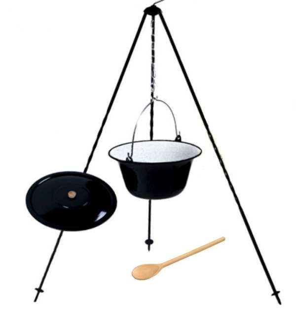 A 13 literes zománcozott üst a szabadtéri főzés elengedhetetlen kelléke. A kiváló minőségű zománcozott acélból készült üstöt aprólékosan megmunkálják és magas hőmérsékleten égetik, így biztosítva tartósságát és időjárásállóságát. Vastag belseje megakadályozza az ételek leragadását és megkönnyíti a tisztítást, optimálisan kialakított vastagsága pedig egyenletes melegítést biztosít. A masszív konstrukció hosszú évekig tartó használatot ígér. Specifikációk: Anyaga: zománcozott acél Űrtartalom: 13 l Akasztógyűrű: igen Felső átmérő: 41 cm Alsó átmérő: 22 cm Magassága: 24 cm Állvány maximális magassága: 120 cm Lánc hossza: 24 cm