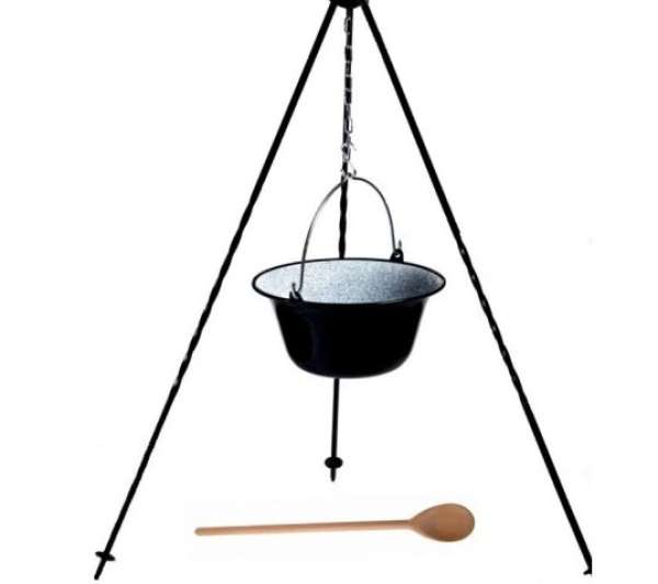 A tűz fölé függesztett üst feldobja a családdal és barátokkal töltött pillanatokat. Az üst kiváló minőségű zománcozott acélból készült, aprólékosan megmunkált és magas hőmérsékleten égetett, ami hatással van az ellenállóságára és az időjárási tényezőkre. Az üst belseje durva, ami megakadályozza, hogy az ételek az üst falához tapadjanak, és jelentősen megkönnyíti a tisztítását. A falak és az alj optimálisan kialakított vastagsága biztosítja az egyenletes melegedést a teljes felületen. A masszív és tartós konstrukció garantálja az üst hosszú évekig tartó használatát.Műszaki adatok:Anyaga: zománcozott acélTérfogat: 3 literÁllvány: 120 cmKeverőpálca: igenKönnyű tisztításFelakasztható tartozék: igen