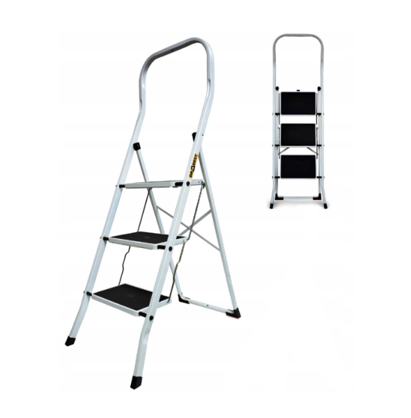 Stabilitás és kényelem otthon, az irodában vagy a konyhában. A létra kiváló alacsony magasságban végzett munkához, a meghosszabbított korlát pedig védelmet nyújt a létráról való esetleges leesés ellen. A lépcsők mérete 30 x 20 cm, csúszásmentes műanyag felülettel vannak ellátva. Ellenálló és tartós acélból készült, mely fehér lakk réteggel van bevonva. Korrózióálló tulajdonságokkal rendelkező acél. Specifikációk:Anyaga: acélMunkamagasság_ 2,7 mMaximális teherbírás: 150 kgSúlya: 7 kgMéretek: 47 x 77 x 141 cm (SzéxMéxMa)