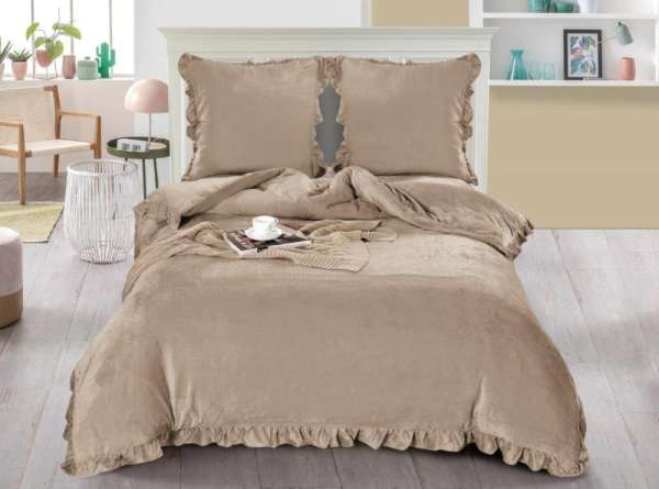 Egyszínű, kellemes tapintású, puha takaró textúrájú szövetből készült egyszínű lepedő. A lepedő bársonyos, nagyon puha tapintású és meleg. Fodrokkal díszített. Ideális hűvösebb estékre.Specifikációk: Szín: bézsAnyag_ 100% poliészterMérettűrés: +/- 5%A párnahuzat és a párnahuzat cipzárral záródik.Kérjük, vegye figyelembe, hogy a színek a monitor beállításaitól függően változhatnak. A mosási információkért kérjük, olvassa el a címkét.