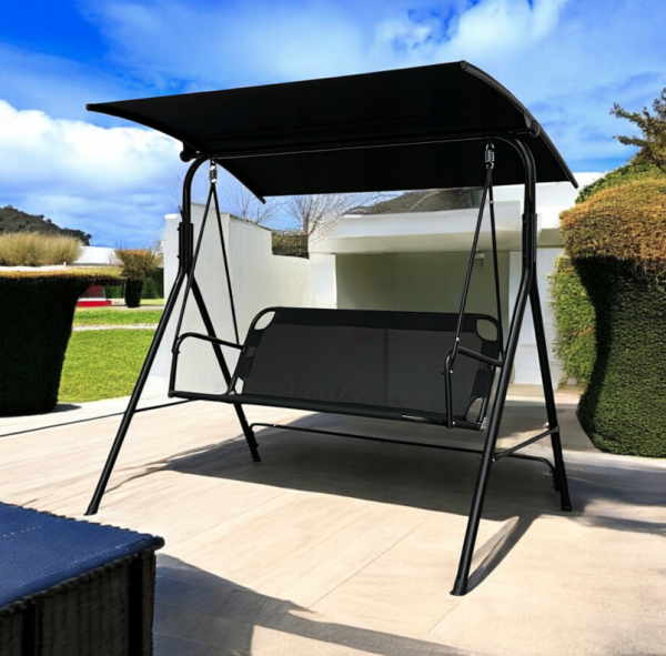 Élvezze a pihenés pillanatait saját kertjében a stílusos és kényelmes, elegáns kivitelű, 3 személyes kerti hintával. Ez a stabil fém hinta baldachinnal a tökéletes pihenéshez készült - árnyékban, kényelemben és teljes nyugalomban.A tartós porszórt acélszerkezet hosszú élettartamot és kiváló stabilitást garantál még maximális terhelés mellett is. A tágas üléssel ellátott hinta akár három felnőttnek is kényelmesen elfér, terhelhetősége pedig akár 240 kg is lehet. A fokozatmentesen állítható előtető megvéd a napsütéstől, és pontosan ott teremt árnyékot, ahol szüksége van rá. A rugós felfüggesztésnek köszönhetően a hintázás lágy, csendes és kényelmes - tökéletes egy könyv olvasásához, kávézáshoz vagy délutáni pihenéshez.Egyszerűen helyezze a hintát a teraszra, a kertbe vagy a pavilonba, ahol gyorsan kényelmi központtá és az egész család kedvenc helyévé válik. És a karbantartás? Teljesen gondozásmentes - csak egy nedves ruhával.Műszaki adatok:Szín: feketeKapacitás: 3 személyTerhelhetőség_ 240 kg-igFelépítés: porszórt acélhuzat: tartós szövetA hinta méretei: 172 x 154 x 110 cm (Sz x H x D)Ülésméretek: 130 x 45 x 45 cm (B x H x T)Tulajdonságok:Állítható napellenzőRugós felfüggesztés a kényelmes hintázásértCsúszásmentes lábvégekUV- és időjárásálló