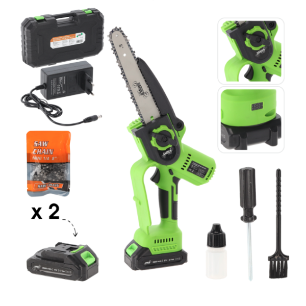 A nagy teljesítményű akkumulátoros ágvágó ideális a fák, bokrok és kerti munkák metszéséhez. A kefe nélküli motornak, a könnyű súlynak és az ergonomikus kialakításnak köszönhetően kényelmes kezelhetőséget és hatékony teljesítményt biztosít vezeték nélkül. A csomagban 2 db 2 Ah-s akkumulátor, egy töltő és egy tartalék fűrészlánc található - minden, amire szüksége van a szünet nélküli kerti munkához. Műszaki adatok: Feszültség_ 21 V Maximális teljesítmény: 900 W Terheletlen fordulatszám: 4500 fordulat/perc Rúdhossz: 20 cm Energiaellátás típusa: akkumulátor Akkumulátor kapacitása: 2 Ah Csomag tartalma: 2 x 2 Ah akkumulátor, töltő, tartalék lánc