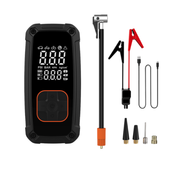 A 3 az 1-ben multifunkciós készülék - indító, kompresszor és energiabank - ideális minden olyan járművezető számára, aki minden helyzetben biztonságban akar lenni. Ez a nagy teljesítményű, 14,8 V-os, 120 W-os autós kompresszor a mellékelt indítókábelek segítségével gyorsan felfújja a gumiabroncsokat, feltölti az elektronikát és szükség esetén elindítja az autót. A készülék 8000 mAh kapacitású akkumulátorral, digitális kijelzővel, automatikus kikapcsolással a célnyomás elérésekor, valamint beépített LED-lámpával rendelkezik, amely három üzemmóddal - normál, SOS és villogó - rendelkezik. Támogatja a 4 nyomásegységet (PSI, BAR, KPA, KG/CM²) és 5 gyorsválasztási módot az autós, motorkerékpáros, kerékpáros, labdás vagy kézi beállításokhoz. A 400 A (800 A csúcs) indítóárammal megbízhatóan indítja a legtöbb benzin- vagy dízelmotoros járművet. Kompakt kialakítása, beépített hűtőventilátora és USB/USB-C porttal ellátott powerbankja felbecsülhetetlen értékű társsá teszi az úton és a garázsban. Műszaki adatok: Feszültség_ DC 14,8 V Teljesítmény: 120 W Akkumulátor kapacitása: 8000 mAh (29,6 Wh) Max. nyomás: 150 PSI / 10,3 BAR Levegőáramlás: 23 l/min Indítási áram: 400 A Csúcsáram: 800 A Felfújási idő: kb. 5,5 perc (195/55/R15 gumiabroncs) Gumiabroncsok száma töltésenként: legfeljebb 6 db Bemenet: (5V/2.4A) USB Output: 5V/2A LED-fény: 3 üzemmód (fehér, SOS, piros villogó) Zajszint: <85 dB Légtömlő hossza: 25 cm A készlet tartalmazza: Hordozható indítómotor 14,8 V-os kompresszorral, Smart Jump starter kábel, 4 különböző fúvókát, USB-C töltőkábel