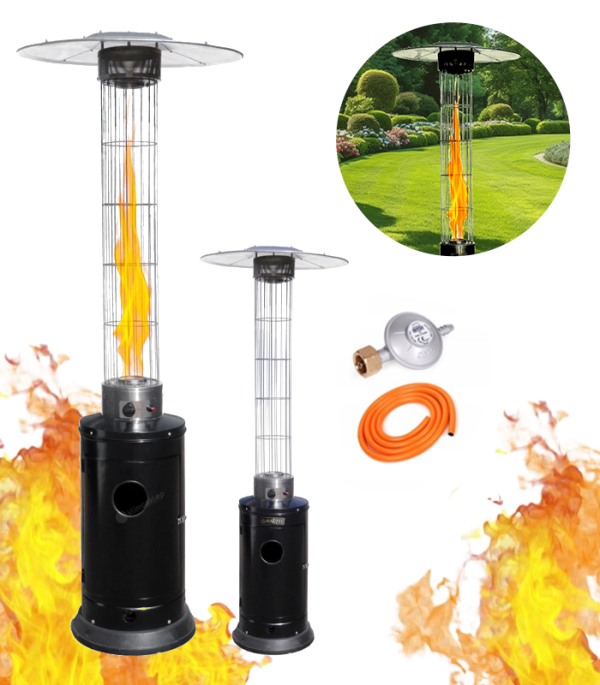 Ez a kerti gázfűtés stílusos és hatékony megoldás mindazok számára, akik kellemes és meleg hangulatot szeretnének teremteni a teraszon, a kertben vagy a vendéglátóhelyen. Az üvegcsővel ellátott, magas színvonalú, modern kialakításnak köszönhetően a természetes láng teljes mértékben kibontakozik, így egyedülálló dekoratív hatást kelt, miközben még a hidegebb napokon is kellemes meleget biztosít. A látható tűz elegáns, szinte fényűző hangulatot kölcsönöz a térnek, és élvezetessé teszi a szabadban való tartózkodást.A fűtőtest tartós porszórt acélból készült, amely megbízhatóan ellenáll az időjárásnak. Az 5000-12500 W-os teljesítménytartománynak köszönhetően még a nagyobb szabadtéri területek is hatékonyan fűthetők, a széles és stabil talp pedig biztonságos használatot biztosít. Az intuitív működés és a zökkenőmentes gyújtás alkalmassá teszi a készüléket otthonokba, kereskedelmi helyiségekbe és éttermi teraszokra.A propán vagy bután kerti fűtőberendezés megbízható meleget, esztétikai élvezetet és praktikus használatot biztosít egyben. Ideális mindazok számára, akik a teljesítmény, az elegancia és a biztonságos működés kombinációját keresik.Műszaki adatok:Típus: gázüzemű kültéri fűtőtest / teraszfűtőtestAlap: ø 455 × 85,5 mmPalacktartó: ø 370 × 820 mmVédőrács: ø 200 × 1170 mmÜvegcső: ø 100 × 1060 mmReflektorfej (4 szekció): ø 705 mmTeljes magasság_ 2150 mmTeljesítmény: 5000-12500 wGáz: propán-butánGázfogyasztás:g30: 910 g/hg31: 893 g/h