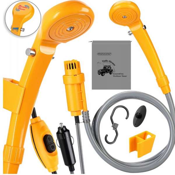 A hordozható kempingzuhany MONZANA® 12V-os szivattyúval praktikus segítője az utazás, kempingezés, horgászat vagy szabadtéri tevékenységek szerelmeseinek. A 12V-os autós töltőhöz való egyszerű csatlakoztatásnak köszönhetően bárhol élvezheti a frissítő zuhanyt - hálózati áram nélkül. A zuhany egy nagy teljesítményű 12V-os merülőszivattyúval van felszerelve, amely szűrőszivaccsal biztosítja a víz egyenletes és hatékony áramlását. A beépített kapcsolóval ellátott 5 méteres tápkábel nagy rugalmasságot biztosít a zuhany elhelyezésében. A víznyomás könnyen szabályozható közvetlenül a zuhanyfejnél, amely a 2 méteres zuhanytömlő-rendszerhez csatlakozik. A Camping zuhany rendkívül sokoldalúan használható - a személyi higiénia mellett kutyatusaként, autómosásra, az ablakok por- és rovarmentesítésére vagy a kertben a zöldségek leöblítésére is használható. A praktikus tapadókorongnak az autó karosszériáján és a tartóval ellátott dupla kampónak köszönhetően a zuhanyfej bárhová könnyedén felakasztható a terepen. Egy vízálló hordtáska is jár hozzá, nemcsak a tároláshoz, hanem a víz szállításához is, így a zuhanyfej mindig kéznél van - otthon és útközben is. Specifikációk: Teljesítmény: DC 12V (autós töltő) Tápkábel hossza: 5 m Tömlő hossza: 2 m Anyag_ ABS műanyag Merülő szivattyú átmérője: 45 mm 1× kempingzuhany (szivattyú, tömlő, zuhanyfej, kábel kapcsolóval) 1× tapadókorong + dupla kampó tartóval 1× vízálló tárolótáska