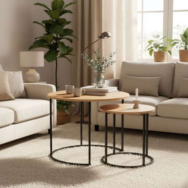 Ez az elegáns dohányzóasztal-készlet praktikus és rugalmas megoldás a nappaliban, a hálószobában és az irodában. A két kerek asztal együtt modern dohányzóasztalként vagy külön-külön tárolóasztalként használható, a tér igényeitől függően. Az okos méretek lehetővé teszik, hogy a kisebbik asztalt a nagyobbik alá csúsztassa, így könnyen helyet takaríthat meg és variálhatóságot nyerhet a belsőépítészetben. A stabil fémszerkezetű, porszórt bevonattal ellátott kivitel garantálja az erőt és a tartósságot a mindennapi használat során. A világos tölgyfa kivitelű laminált MDF-lapok tartós és könnyen ápolható felületet alkotnak, amely természetesnek és időtállónak tűnik. A csúszásmentes lábak növelik az asztalok stabilitását, miközben védik a padlót a karcolásoktól. Specifikációk: Terméktípus: 2 db-os dohányzóasztal szett Forma: kerek Anyag_ fém és mdf Lemez vastagsága: 1,5 cm Beilleszthető asztalok: igen Súly: 7 kg