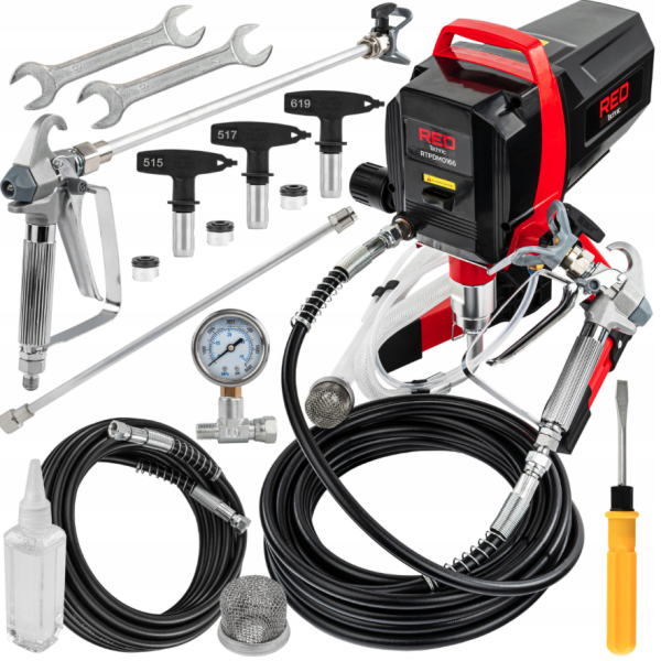 A festőegység egy nagy teljesítményű, AIRLESS típusú szóróberendezés, amely lehetővé teszi nagy területek gyors és egyenletes festését henger vagy ecset használata nélkül. Az 1200 W teljesítményű, 230 bar maximális nyomással és 1,7 l/perc áramlási sebességgel hatékonyan képes festéket felvinni a falakra, mennyezetekre, homlokzatokra vagy padlókra, és jelentősen felgyorsítja a festési munkálatokat. A AIRLESS technológia (levegő nélkül) nagy nyomás alatt oszlatja el a festéket, egyenletes réteget hozva létre csíkok és egyenetlenségek nélkül. Ez a felhordási mód csökkenti a festékfogyasztást is, és nagy felületeken is professzionális eredményt biztosít. A készülék munkanyomás-szabályozóval van felszerelve, amely lehetővé teszi a permetezés intenzitásának beállítását a festéktípusnak és a felületnek megfelelően. Ez lehetővé teszi a különböző festékekkel - például emulziós, akril- vagy latexfestékekkel, valamint impregnálásokkal és egyes védőbevonatokkal - való munkát. A készülékhez tartozik egy 10 méteres nagynyomású tömlő, amely nagy mozgásszabadságot biztosít a munkavégzés során anélkül, hogy a gépet gyakran kellene mozgatni. Az 50 cm-es hosszabbító rúddal könnyedén permetezhetők a mennyezetek és a falak magasabb részei anélkül, hogy állandóan létrát kellene használni. A festőegységet három fúvókával (515, 517 és 619) szállítjuk, amelyek lehetővé teszik, hogy a permetezés szélessége és intenzitása a különböző felületekhez és festéktípusokhoz igazodjon. A beépített nyomásmérő áttekintést nyújt az aktuális üzemi nyomásról, és segít a stabil teljesítmény fenntartásában munka közben. A praktikus szűrőrendszer és a PRIME / SPRAY kapcsoló megkönnyíti a gép indítását, stabilizálja a festékáramlást, és a munka befejezése után a takarítást is leegyszerűsíti. Ez a festőegység AIRLESS ideális professzionális festők, építőipari cégek és barkácsolók számára, akik gyorsan és hatékonyan szeretnének nagy felületeket festeni professzionális eredménnyel. Műszaki adatok: Tápegység_ 230 V / 50 Hz Maximális teljesítmény: 1200 w Maximális nyomás: 230 bar Festékáramlás: 1,7 l/min Maximális festék viszkozitás: 110 din-sec Zajszint (LpA): 84,7 db Zajszint (LwA): 93,6 db Garantált zajszint: 110 db Rezgésszint: 1,215 m/s² Védelmi osztály: ii Hálózati kábel hossza: 150 cm A készülék súlya: 7 kg A készülék méretei: 31 × 27 × 39 cm