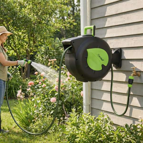 Egyszerűsítse a kert öntözését, és egyszer s mindenkorra szabaduljon meg a kusza tömlőtől. Az automata kerti tömlődob praktikus megoldás a rendezett, kényelmes és könnyedén hatékony öntözéshez. Használat után a tömlő automatikusan visszatekeredik a burkolatba, így időt és helyet takaríthat meg.Az orsó 30 méteres tömlővel van felszerelve, így a kert távolabbi részeit is kényelmesen elérheti anélkül, hogy állandóan mozognia kellene. A praktikus reteszelő mechanizmus lehetővé teszi a kívánt tömlőhossz beállítását, és használat közben stabilan tartja a tömlőt. A fali rögzítés a 180°-os elforgatási lehetőséggel együtt maximális rugalmasságot biztosít munkavégzés közben, és csökkenti a tömlő elgörbülésének kockázatát. A mellékelt 7 üzemmódú szórópisztoly segítségével a vízáram az Ön igényeihez igazítható - a kíméletes öntözéstől az intenzív tisztításig. Az orsó kompatibilis a szabványos 1/2" és 3/4" csapokkal, és maximum 6 bar nyomáson működik, így megbízható teljesítményt biztosít a háztartási körülmények között. A kiváló minőségű anyagok garantálják a tartósságot és a hosszú élettartamot rendszeres használat mellett is.Ez az automata kerti tömlődob ideális választás mindenkinek, aki szeretné, hogy a kert rendben legyen, a tömlő mindig készenlétben álljon és az öntözés könnyedén menjen.Specifikációk:Tömlő hossza: 30 mVezetőtömlő hossza: 2 mTömlőátmérő: 11 mm (belső), 15 mm (külső)Maximális nyomás: 6 barKompatibilitás: 1/2" és 3/4" csapokSzerelés: falra szerelhető, 180°-ban elforgathatóFunkciók: automatikus tekercselés, hosszrögzítésTartozékok: szórópisztoly (7 üzemmód), állítható fúvókaMéretek: 64 x 26,5 x 47 cmSúly: 12,25 kgAnyag_ pp, pvc, abs