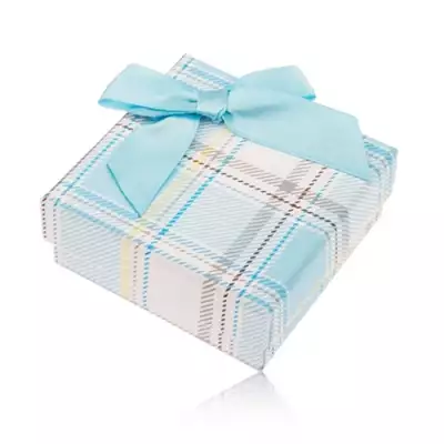 Ajándékdoboz gyűrűnek és fülbevalónak, kockás motívum, világoskék masni