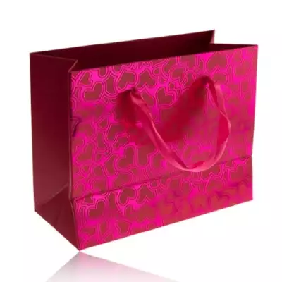 Ajándék táska, fényes rózsaszín felület, matt egyenetlen szívek, szalagok