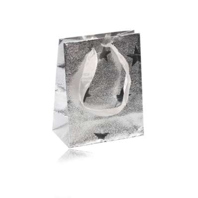 Ajándék táska ezüst színben - csillagokkal, bordázott felülettel, szalagokkal