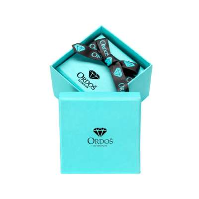 Ajándékdoboz gyémánt ékszerekhez - türkizkék dizájn logóval és fekete masnival, négyzet alakú