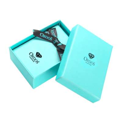 Ajándékdoboz gyémánt ékszerekhez - türkizkék dizájn logóval és fekete masnival, téglalap alakú