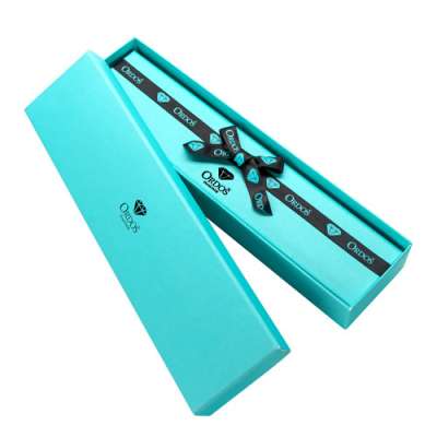 Ajándékdoboz gyémánt ékszerekhez - türkizkék mintás, logóval és fekete masnival, hosszúkás forma