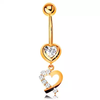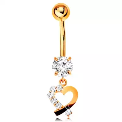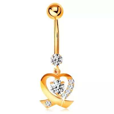 14K arany köldök piercing - csillogó szív körvonal, kerek átlátszó cirkóniák