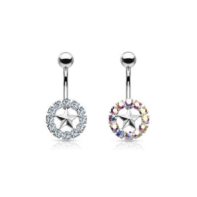 316L acél köldök piercing, ródium bevonattal - kör átlátszó kristályokkal, csillaggal - Szín: Átlátszó