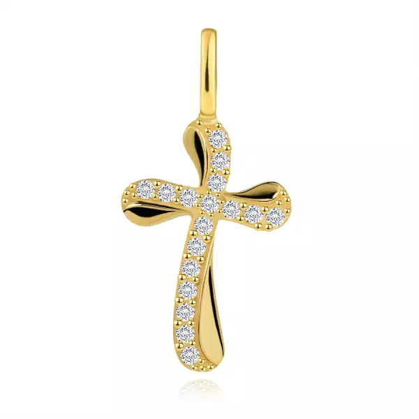 Medál sárga 14K aranyból, hullámos latin kereszt csillogó, átlátszó cirkóniákból álló vonalakkal a szárakon.