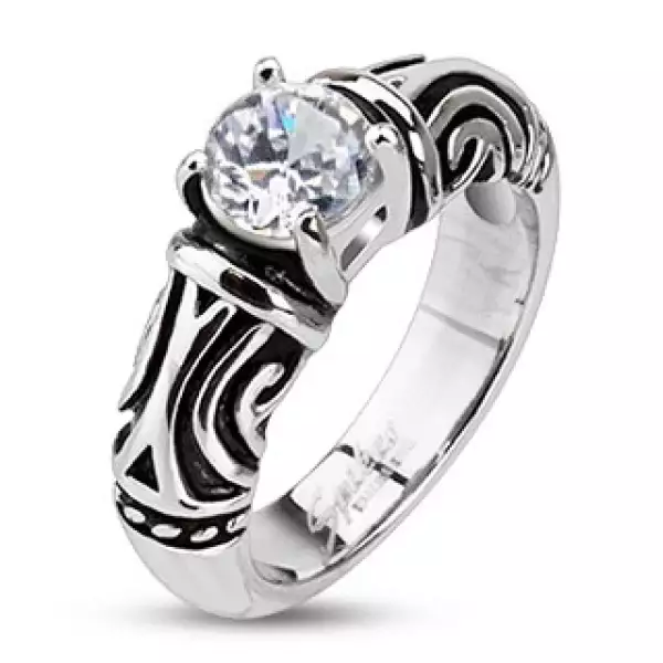 Orvosi acél gyűrű törzsi motívummal és cirkóniával.