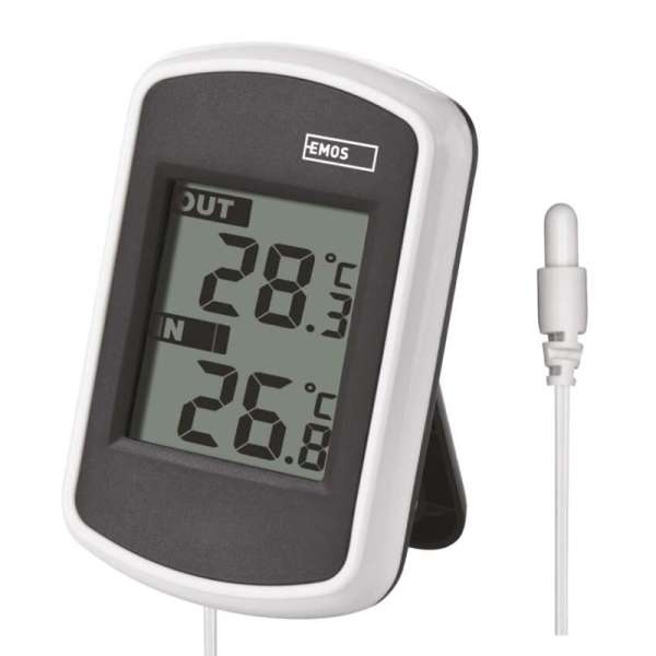 Termék leírásVezetékes hőmérő a beltéri és kültéri hőmérséklet kijelzésével. A hőmérő 2 m hosszú vezetékes érzékelővel rendelkezik.