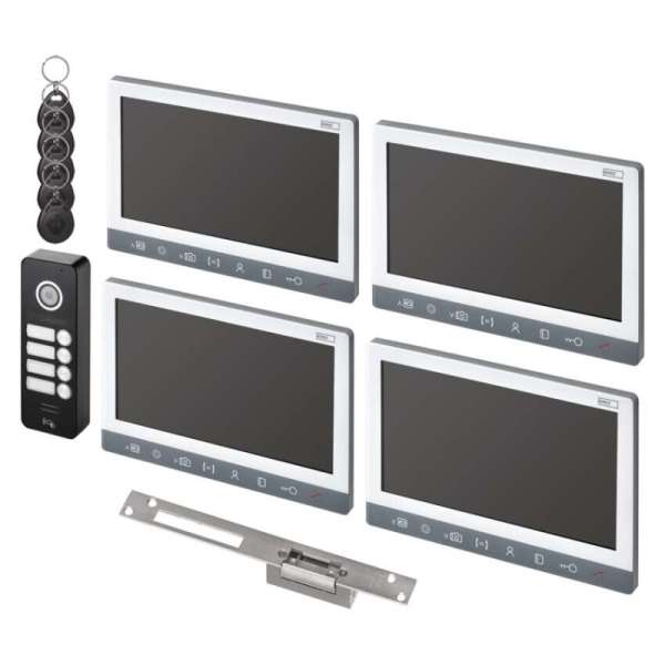 monitorok száma 4+0+0, kameraegységek száma 1, kameraegység gombjainak száma 4+0+0, ajtózár tartozék igen, tápegység a zárhoz mellékelve nem
