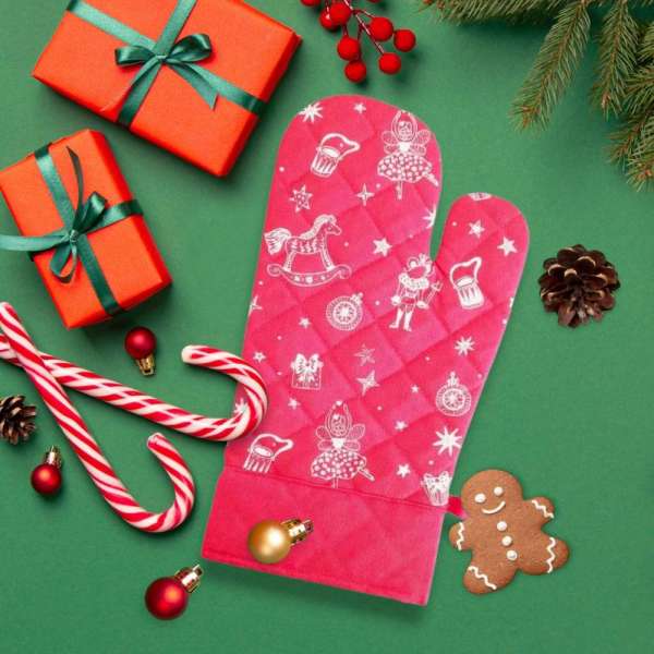 Varázsoljon ünnepi hangulatot a konyhába ezzel a piros, karácsonyi tündérmese mintás edényfogó kesztyűvel! A kesztyű 18 x 30 cm-es mérete ideális védelmet nyújt sütés-főzés közben, így a forró edények kezelése kényelmes és biztonságos lesz. A 100% pamut anyag biztosítja a puha tapintást és a kiváló szellőzést, míg a tündéri karácsonyi minták hangulatossá teszik az ünnepi konyhai pillanatokat.