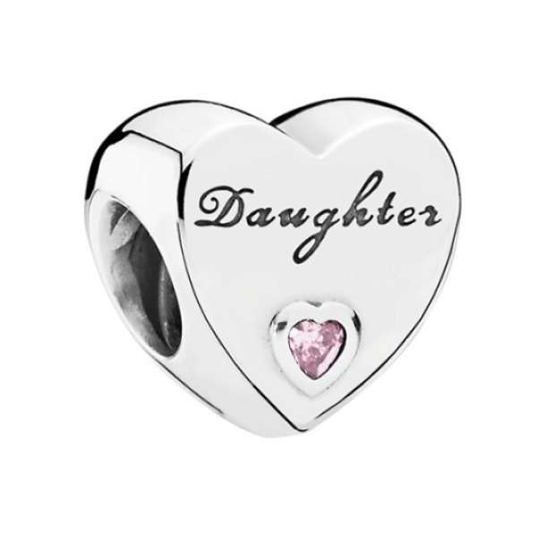 Ezüst PANDORA szív alakú charm, "Lányom" felirattal és rózsaszín cirkóniával. Mindig emlékezz a lányod szeretetére. Súly: 4 g