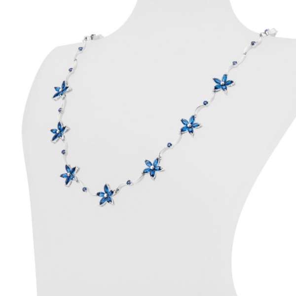 Ezüst nyaklánc kék cirkóniákkal és virágmotívummal díszítve. Anyaga: 925/1000 ezüst, a Fémjelzési törvénynek megfelelően fémjelezve, kék cirkóniák. Hossza: 45 cm Súly: 15 g