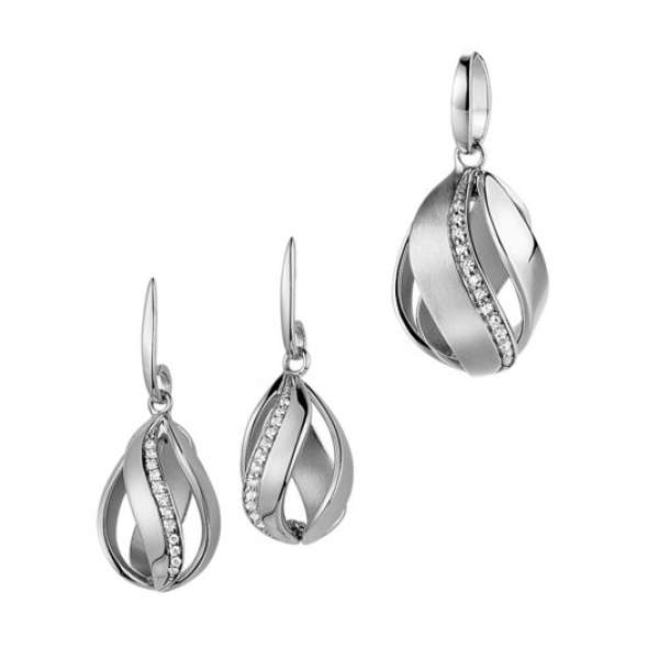 Ezüst foglalatban átlátszó cirkónium kövek. A szett egy medálból és egy fülbevalóból áll.