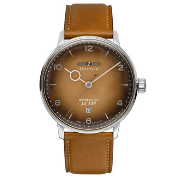 Férfi Zeppelin Hindenburg karóra. Számlap: analóg Számlap anyaga: acél Számlap átmérője: 40 mm Óra üvege: ásványi Vízállóság_ 5 ATM (zuhany) Szíj: barna bőr Óra meghajtó: elem Óramű: Kvarc analóg