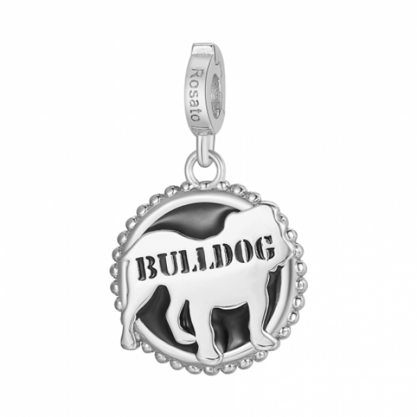 Rosato ezüst charm medál Bulldog kutya "BULLDOG" (Bulldog) és "THE BOSS" felirattal - erős, egyedi és szeretetteljes. Súly: 2,5 g. Méret: 21,5 mm. A charmok kompatibilisek a ROSATO márkájú karkötőkkel és fülbevalókkal, amelyekre felfüggesztheti őket, és tetszés szerint váltogathatja azokat. Az ilyen eredeti karkötők és fülbevalók pontosan és hűen visszaadják az egyedi stílusát.