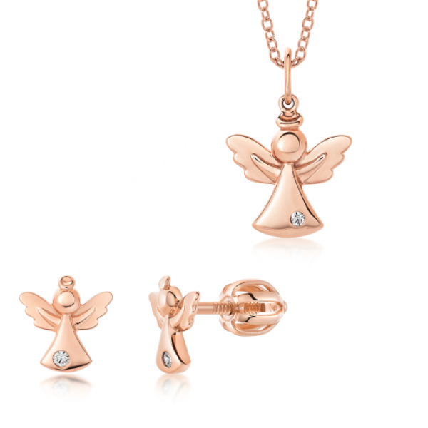 Arany szett medál és fülbevaló angyalkákkal, átlátszó cirkóniákkal. Az ékszer 14 karátos rózsa aranyból készült. A lánc nem tartozék. Medál mérete: 11 x 16,5 mm fogantyúval. Súly: 0,6 g. A fülbevaló mérete: 8 x 8 mm. Súly: 1 g.